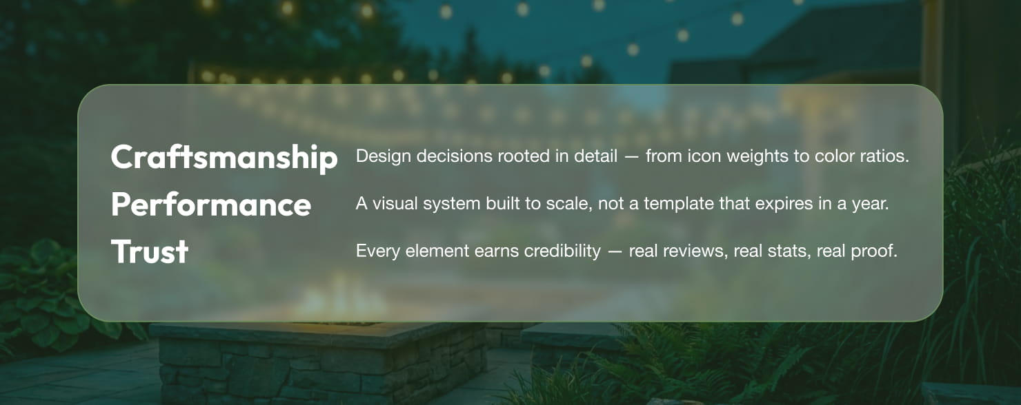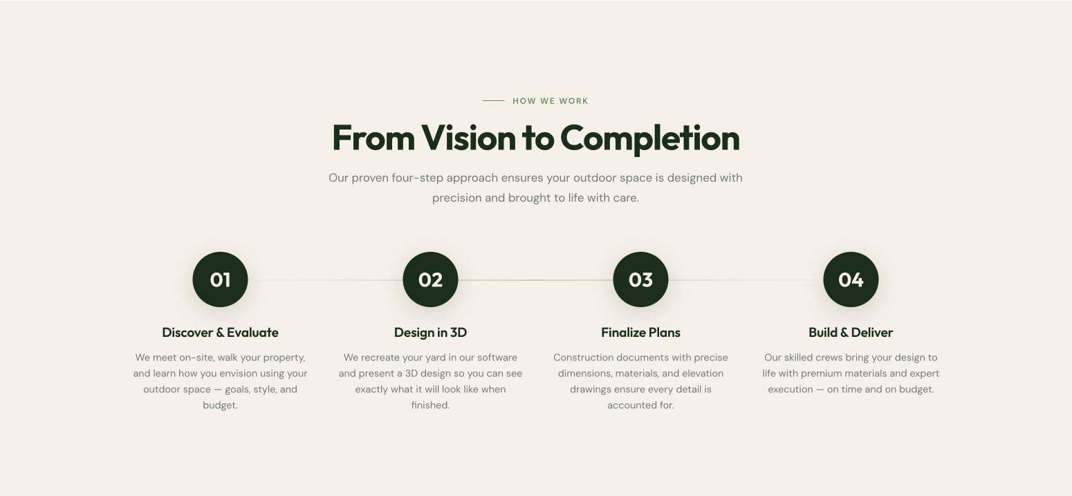 Homeowners investing $10K–$100K+ in their property want to know what the process looks like before they pick up the phone. We designed a four-step visual flow that demystifies the experience and reduces the anxiety that keeps prospects from reaching out.