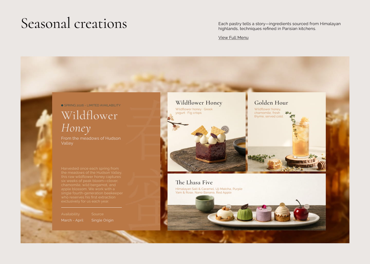The Solution: Bento grid layout that tells the ingredient story — where the honey comes from, why it's special, and what pastries feature it.